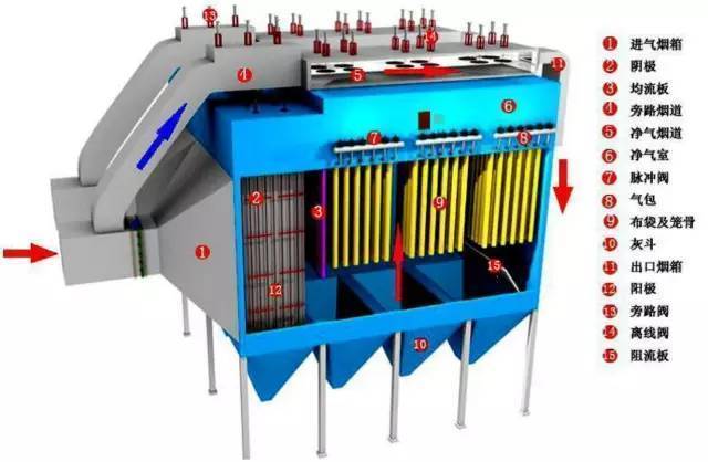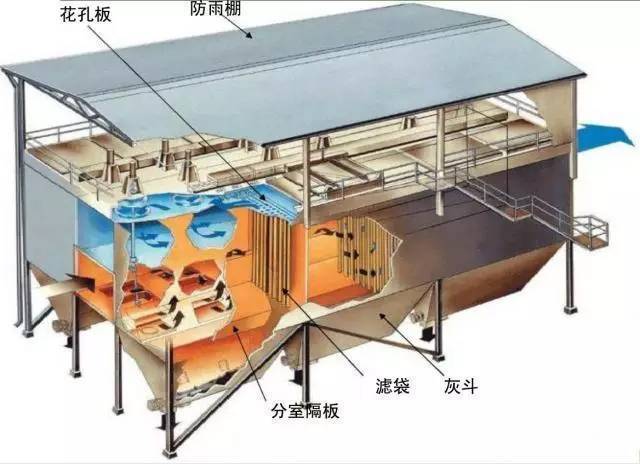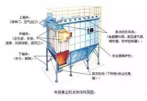 布袋式除塵器整體結(jié)構(gòu)示意圖 布袋式除塵器是各類除塵器中應(yīng)用好多的一類,主要在于其除塵效率高,能滿足嚴(yán)格的環(huán)保要求;運(yùn)行穩(wěn)定,適應(yīng)能力強(qiáng),每小時(shí)可處理氣量從幾百立方米到數(shù)百萬(wàn)立方米并適用于許多工礦企業(yè)除塵工程的凈化設(shè)備。