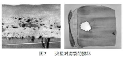 除了高溫燒毀外,煙氣中的火星對濾袋的損害也是非常嚴重的。如焦爐、干燥窯、鏈條爐、沖天爐、電爐、高爐、混鐵爐等在生產過程中會有大量的火星混入煙氣中,如對火星處理不及時,尤其是濾袋表面粉塵層較薄時,火星就會將濾袋燒穿,形成不規則的圓洞(如圖2)。但當濾袋表面粉塵層較厚時,火星不會將濾袋直接燒穿,而會造成濾袋表面形成深顏色的烘烤痕跡。