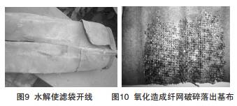 纖維氧化是纖維中分子失去(或離解)電子的過程,如PPS纖維,在高溫(150℃)條件下氧分子攻擊分 子中的“S”,并與之結合。造成PPS纖維變色、變硬、 變脆,強度降低而破損,嚴重時纖網會破碎而脫離基布 (如圖10)。氧化是濾袋損壞的又一主要因素??寡趸? 性能較差的濾料主要有:聚丙烯、聚苯硫醚(PPS)等。