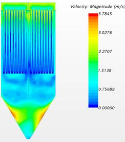 另,通過對除塵器內部流場CFD分析對比得知,將濾袋替換為濾筒后,內部流場大為改善,大幅減少濾芯底部的沖刷,提高了使用壽命。在濾筒的下方區域形成較大的灰塵沉降區,利于大顆粒的預沉降,除塵效果更加優異。