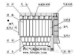 含粉塵氣體進入袋除塵器后,經過導流板分布導向過濾元件。入口部位的作用是降低進入粉塵的運行速度,并利用重力原理使大顆粒的粉塵直接沉降,從而產生到達過濾元件均衡分布的氣流。這樣可使粉塵氣流不會對過濾元件產生過多的磨損。當含粉塵氣體被引導通過過濾元件時,凈化的氣體穿透過濾元件,進入凈氣室(花板上面部分),粉塵則被捕集在過濾元件的外側。干凈的氣體從凈氣室經過風機的引導從煙囪排出。