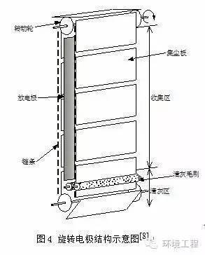 旋轉(zhuǎn)電極式電除塵器與常規(guī)電除塵器的除塵原理完全相同,在清灰方式上有很大改變。旋轉(zhuǎn)電極是由若干個(gè)小塊極板固定在板鏈上低速旋轉(zhuǎn),極板由原來的整體壓型板改為小塊極板,通過板鏈帶動(dòng)旋轉(zhuǎn)。其清灰方式采用旋轉(zhuǎn)鋼刷清灰,從根本上改變了常規(guī)電除塵器的振打裝置清灰,徹底避免了振打清灰造成的二次揚(yáng)塵, 同時(shí)也解決了高比電阻粉塵的“反電暈”問題。